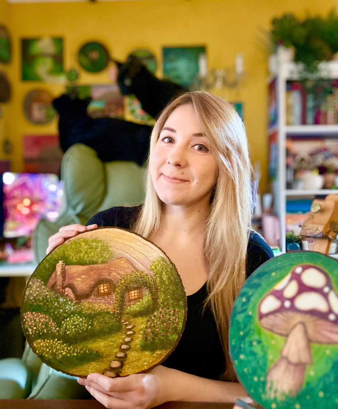 Each piece in my shop is designed and crafted with love and care, whether it’s a tiny hand-painted pendant, a fantasy or woodland-inspired original painting, or a cute seasonal painted woodslice.
