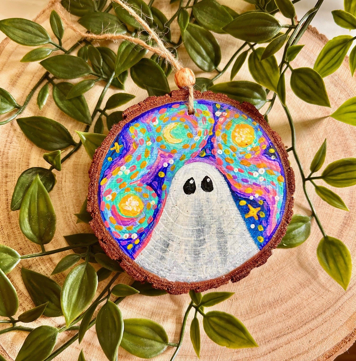 👻Bring a little ghostly charm to your autumn decor with this hand-painted wooden slice ornament.
